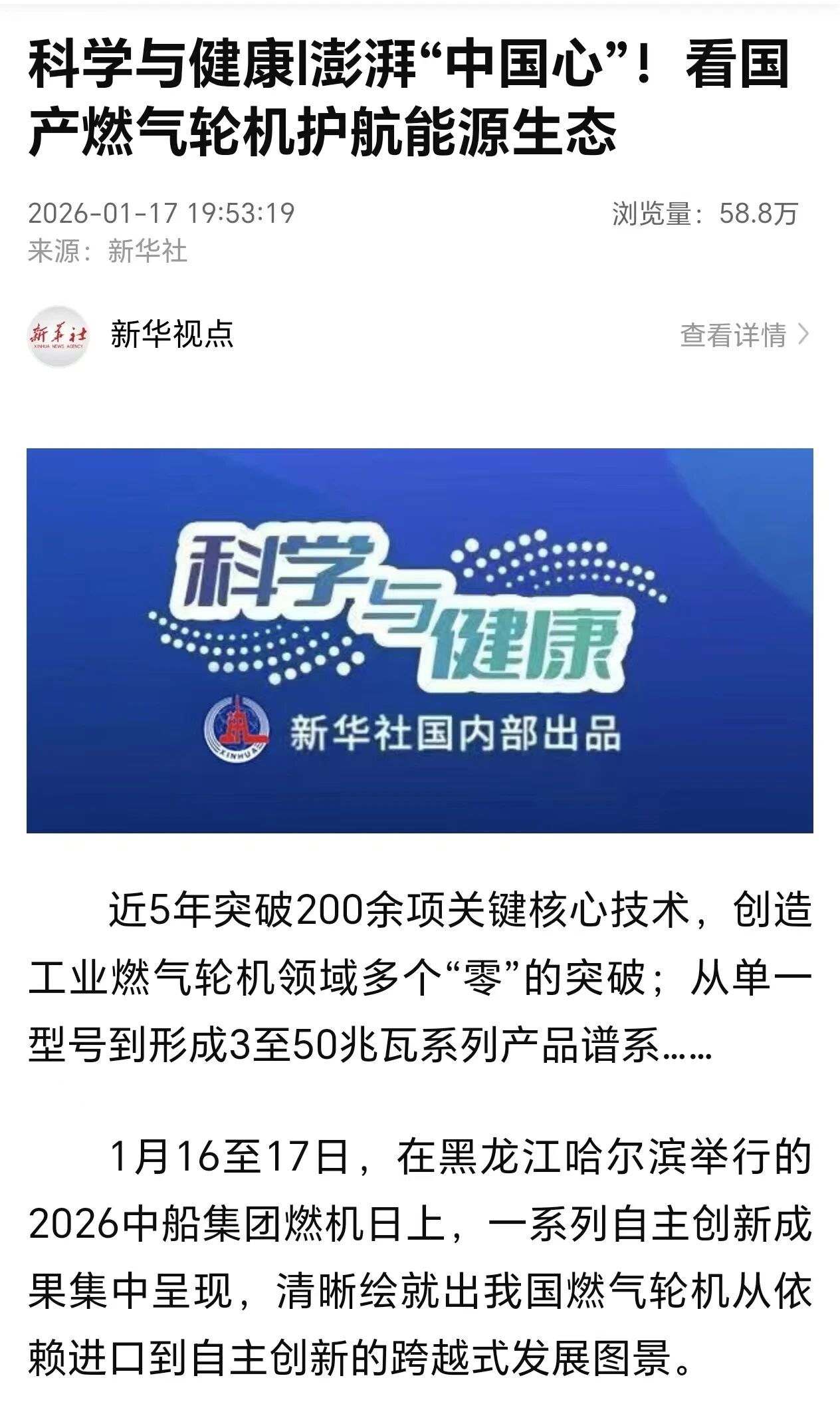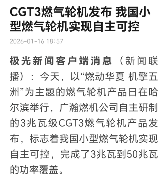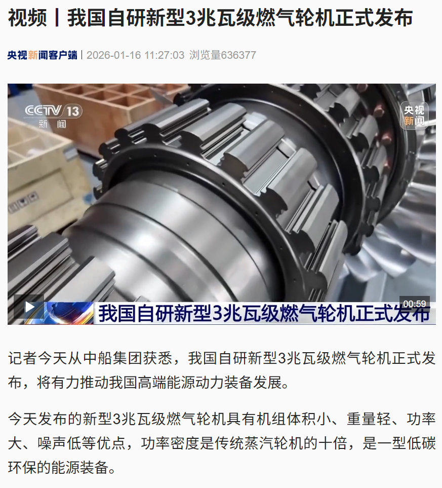 燃动华夏 机擎五洲。1月16日-17日,2026中船集团燃机日活动在黑龙江哈尔滨举行,由中船集团七〇三所自主研制的CGT3燃气轮机在活动期间重磅发布。CGT3燃气轮机核心指标全面对标国际先进水平,其成功研制标志着我国在中小型燃气轮机领域实现关键突破,活动引发新华社、央视、科技日报、黑龙江日报等多家中央及地方媒体关注报道。
